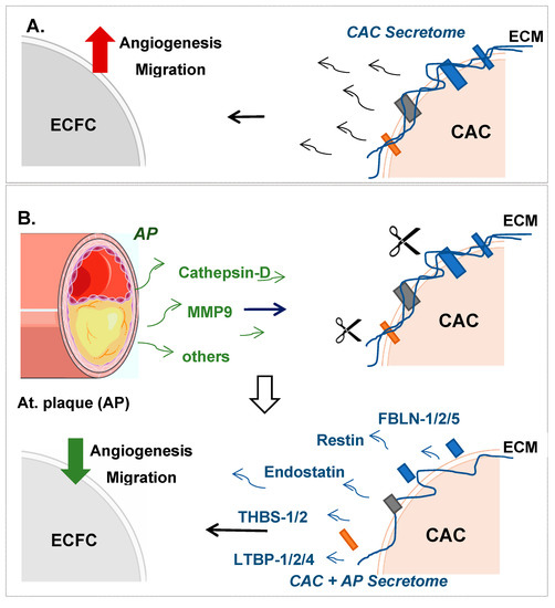 ) ECFC angiogenesis and migration. (B) Incubation of CAC with atherosclerotic factors (Cathepsin-D, MMP9 and other proteases) promotes the rupture and degradation of ECM proteins. Further incubation of ECFC with the CAC released factors (fibulins, endostatin, restin, thrombospondins, LTBP1, etc.) inhibits the paracrine effect of CAC, since angiogenesis and migration of ECFC decreases (