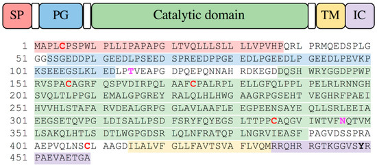 Sequence of native, full length human CA IX. The domains are shown in the image and mapped onto the sequence below using the same colors. Cys residues are shown in red and bold, glycosylated residues are shown in magenta, and phosphorylated residue in bold.