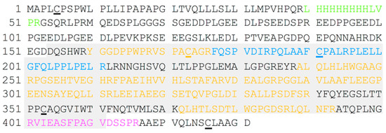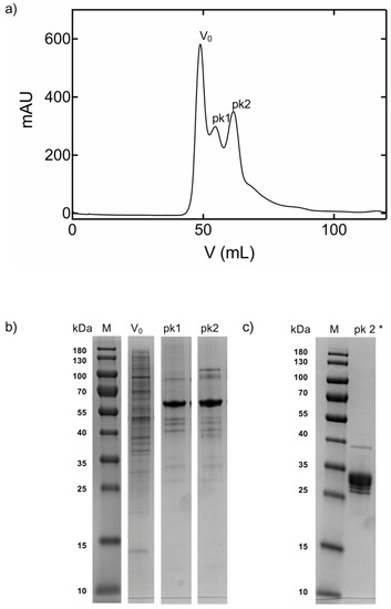 Details of protein production for Construct 1 has been described previously [47]. Briefly, the protein was produced using BEVS and expression was done in Sf9 cells (Invitrogen, Carlsbad, CA, USA). Purification was done by immobilized metal affinity chromatography (IMAC) using HisTrap Excel (GE Healthcare, Chicago, IL, USA) columns equilibrated in buffer (50 mM sodium phosphate, 500 mM NaCl, pH 8.0). Bound protein was eluted by increasing concentrations of imidazole up to 500 mM in the same buffer. A final purification step was done by size exclusion chromatography (SEC) using Superdex200 column (GE Healthcare, Chicago, IL, USA) in 50 mM Tris/HCl, 150 mM NaCl, pH 8.5. The protein also eluted in two peaks (peak 1 and 2) after a large peak at the expected void volume (V0). The fractions were analyzed by sodium dodecyl sulfate-polyacrylamide gel electrophoresis (SDS-PAGE) to assess protein purity and homogeneity (Figure 2).