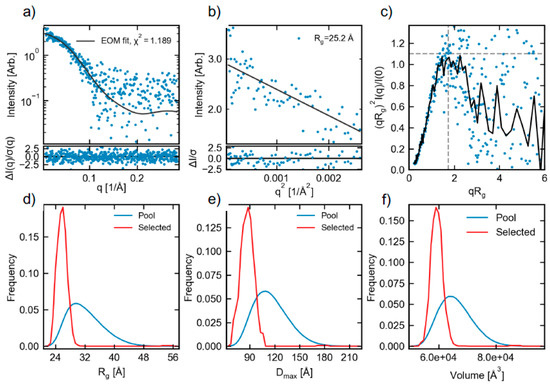 The statistics of the full pool and the selected ensemble also show the more compact and less flexible nature of the molecule, relative to the possible states. For the Rg, the full pool average is 32.1 Å, while the selected ensemble average is 25.9 Å. The average Dmax of the full pool is 115.6 Å, while for the selected ensemble, it is 87.0 Å. The average apparent volume for the full pool is 66,000 Å3, while the average selected ensemble average volume is 59,400 Å3. EOM also provides more advanced metrics for assessing flexibility. Rflex describes the entropy of the system, on a scale from 0 (rigid) to 100% (completely disordered); a more flexible system has a larger Rflex. The Rflex value from the selected ensemble was 52.7%, while for the pool, it was 83.3%. The EOM program also provided an interpretation of the solution conformations as “very compact”, which agrees with our assessment of the results.
