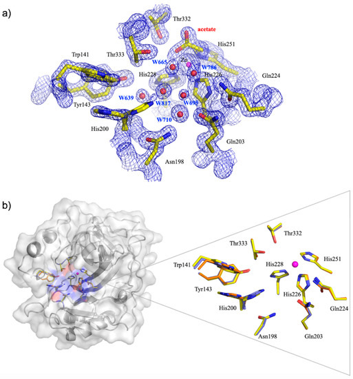 The active site is situated at the base of the conical cleft lined on the one side with hydrophilic amino acid residues (shown in Figure 7a,b: Tyr143, Asn198, His200, Gln203, Gln224, Thr332, Thr333). The hydrophilic residues coordinate an ordered network of solvent molecules that connect the Zn2+ ion to the bulk solvent via His200 (Figure 7a). In the structure reported, we observed density that could only be modeled as an acetate molecule adjacent to the Zn2+ ion and Thr332. Small anions such as sulfate and acetate have some affinity for the active site of CA and despite not having acetate in the crystallization condition, we do observe density corresponding to acetate in the structure (Figure 7a) [45]. Previous structures of native CA IX contained inhibitors (e.g., Acetazolamide in PDB 3iai) as well, but as acetate is a small molecule, we are still able to observe several well-ordered water molecules in the active site of CA IX and the proton shuttle, His200 (His64 in CA II), is also in both in the “in” and “out” conformations.