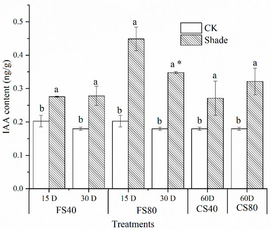 Effects of shade stress on indole-3-acetic acid contents in peanut leaves. Data represent mean ± standard error from three experimental replicates, each with three plants. The indole-3-acetic acid (IAA) was measured in leaves on the main stem after 40% and 80% shading for 15 days, 30 days at the flowering stage (FS), and shading from the seeding stage for 30 days to the flowering stage for another 30 days (CS). The IAA content was calculated as ng per gram fresh leaf weight. Letters a and b after the value represent the statistically significant difference (p < 0.05) between any two conditions within a stage as determined by the Least Significant Difference test. * represents a significant difference (p < 0.05) between different treating durations of 15 days and 30 days. D for days, CK for control under natural sunlight at the same time point.