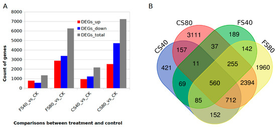 To understand the gene regulation induced by different shade treatments, we generated the transcriptome profiles using a deep RNA-Seq technology for control CK and shade treatments FS40 for 30 days, FS80 for 30 days, CS40 for 60 days, and CS80 for 60 days. Around 8 Gb paired-end Illumina reads were independently generated for each sample in triplicate experiments. After cleaning and mapping reads to peanut reference genome of cultivar Tifrunner [34], the transcripts were constructed with HiSat2 and Stringtie [37], and differentially expressed genes (DEGs) were identified with DESeq2 [38] using previously described parameters [39]. We detected 71,324 expressed genes in all samples. Relative to the transcript abundance in control, we identified 1348, 6260, 2167, and 7237 DEGs in samples with treatments FS40, FS80, CS40, and CS80, respectively (Figure 3A, Data S1, Data S2, Data S3, Data S4,). The 40% shade induced fewer DEGs than 80% shade at both the flowering stage and CS stage, suggesting that a severe shade led to more changes in gene expression in peanut plants. The 80% shade treatment caused more down-regulated DEGs than up-regulated DEGs at both stages of FS and CS. More DEGs were identified in the CS stage than FS, meaning a longer shading caused more expressional changes (Figure 3A). Comparisons of DEGs across samples revealed that 560 genes were shared by all shade treatments, indicating a core set of regulation in response to shade (Figure 3B).