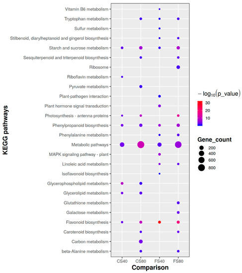 Comparison of enriched metabolism pathways of DEGs induced by shade stress in peanut plants. Only the significantly affected (hypergeometric test p < 0.05) involved by shade induced DEGs were plotted here. The pathways information is from the database KEGG (https://www.genome.jp/kegg/). FS40, FS80, CS40, and CS80 represent DEGs, relative to control under natural sunlight, mined from shade treatments of 40% shade at flowering stage for 30 days, 80% shade at flowering stage for 30 days, 40% shade from seeding stage for 30 days to flowering stage for another 30 days, 80% shade from seeding stage for 30 days to flowering stage for another 30 days, respectively. Three experiments were conducted, each with three plants.