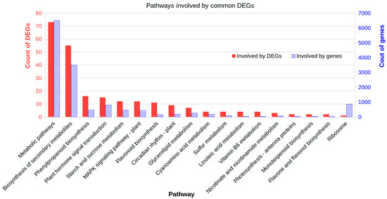 Affected metabolism pathways enriched by common differentially expressed genes (DEGs) induced in all shade treatments. The common DEGs shared by all shade treatments were mapped to the KEGG database (https://www.genome.jp/kegg) and pathway names were extracted. The enrichment was conducted for DEGs involved in each pathway using the genome-scale expressed genes as the background with a hypergeometric test. The plot shows only the significantly enriched pathways (p < 0.05).