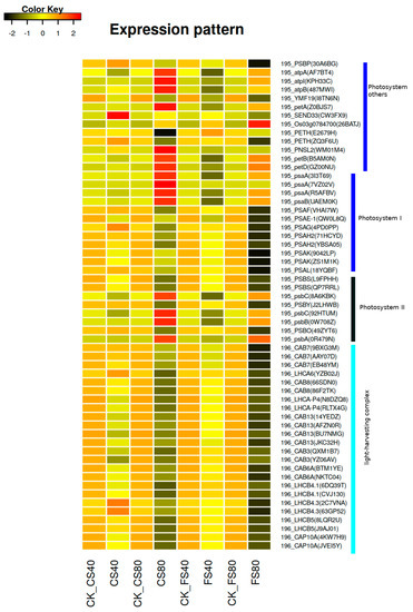 Since shade induced DEGs were enriched in the photosynthesis antenna pathway, we examined the detailed functions and expressional regulation of the DEGs in this pathway. Firstly, DEGs in the photosynthesis antenna pathway were identified in each shade treatment compared with control under natural light; and then annotated against the pathway database KEGG via the tool KAAS [39,40]. In total, 24 DEGs were identified in the photosynthesis antenna pathway (KEGG map id 00196, https://www.genome.jp/kegg/pathway/map/map00196.html), and annotated to encode proteins of two light-harvesting chlorophyll complexes (Table 3). Comparisons of expression levels revealed downregulation of those DEGs at shade treatments except that LHCA6 (gene id YZB02J), LHCB4.3 (gene id 2C7VNA) and LHCB4.3 (63GP52) showed an increase at shade treatment CS40 compared with control (Figure 6, Table S2). We inferred that the downregulation of light-harvesting complex encoding genes could reduce the efficiency of photosynthesis. Therefore, we further investigated DEGs in the photosynthesis pathway (KEGG map id 00195, https://www.genome.jp/kegg/pathway/map/map00195.html). We found a positive association between the abundance of light-harvesting complex encoding genes and the abundance of DEGs in the photosynthesis pathway, where 80% shade treatments induced much lower expression than 40% shade treatments (Figure 6). However, we found treatment CS80 also induced an increase of some DEGs while CS40 treatment decreased the expression of most DEGs. CS80 induced an increased expression of four DEGs of psbC (8A6KBK, 92HTUM), psbB (0W708Z), psbA (0R479N) in photosystem II, four DEGs of pasA (3I3T69, 7VZ02V, R5AFBV), psaB (UAEM0K) photosystem I, seven DEGs of petD (GZ00NU), petB (B5AM0N), PNSL2 (WM01M4), petA (Z0BJS7), atpB (487MWI), atpI (KPH33C) and atpA (AF7BT4) in other systems of photosynthesis. The expression of pasA (7VZ02V) was zero in control and it was only activated after treatment CS80 although at a very low level with the FPKM of 0.3, which may suggest a specific regulation after a very long shade treatment. At the flowering stage, the treatment FS80 induced a greater expressional decrease of most DEGs than the treatment FS40 did. Similarly, the expression levels of some DEGs were increased with FS80, but the increase was much lower than that with CS80 treatment. Those increased DEGs were shared between FS80 and CS80, meaning similar regulatory patterns under shade stresses (Figure 6).