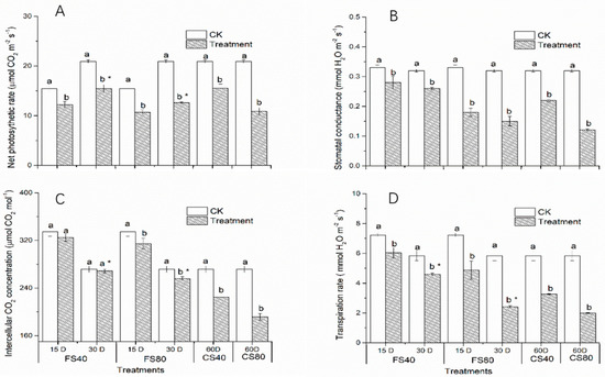Effects of shade stress on photosynthesis parameters in peanut leaves. (A). Changes in net photosynthetic rate, (B). Changes in stomatal conductance, (C). Changes in intercellular CO2 concentration, (D). Changes in transpiration rate. Data represent mean ± standard error. The measurement was conducted on leaves on the main stem after a treatment. Letters a and b after the value represent the statistically significant difference (p < 0.05) between any two conditions within a stage as determined by the Least Significant Difference test. * represents a significant difference at p < 0.05 between different treating durations of 15 days and 30 days. FS40, FS80, CS40, and CS80 represent shade treatments of 40% shade at the flowering stage for 30 days, 80% shade at the flowering stage for 30 days, 40% shade from the seeding stage for 30 days to the flowering stage for another 30 days, 80% shade from the seeding stage for 30 days to the flowering stage for another 30 days, respectively. Three experiments were conducted, each with three plants. CK represents control under natural light.