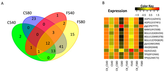 Shade induced common DEGs in starch and sucrose metabolism and their expression patterns. (A). Venn graph showing the common and specific DEGs induced by shade stresses. (B). The expression levels of DEGs in starch and sucrose metabolism. The expression level was calculated as fragment per kilobase per million reads (FPKM) from RNA-Seq data. The color in heatmap represents the z-score after the transformation of log2(mean FPKM). Each row in the heatmap represents the levels of a DEG under different conditions. DEG’s name and gene ID in parenthesis were listed on the right side of the heatmap. The abbreviation of each DEG is given in Table 5. FS40, FS80, CS40, and CS80 represent shade treatments of 40% shade at the flowering stage for 30 days, 80% shade at the flowering stage for 30 days, 40% shade from the seeding stage for 30 days to the flowering stage for another 30 days, 80% shade from the seeding stage for 30 days to the flowering stage for another 30 days, respectively. Three experiments were conducted, each with three plants. CK represents the control under natural sunlight.