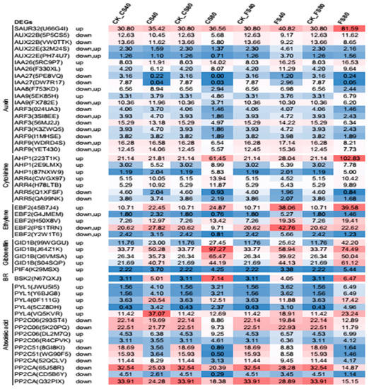 Gene expressional regulation in multiple hormone signal pathways. Abbreviates for DEG encoding proteins: SAUR, small auxin up RNAs like protein, AUX, auxin influx carrier; IAA, auxin-responsive protein IAA; ARF, auxin response factor; AHP, histidine-containing phosphotransferase; A-ARR, two-component response regulator ARR-A family; PYL, abscisic acid receptor PYL family; PP2C, protein phosphatase 2C; EBF, ethylene EIN3-binding F-box protein 2; GID1, gibberellin receptor GID1; PIF, phytochrome interacting factor 4; BR, brassinosteroids, BSK, brassinosteroid signaling kinase; Expression data represent the mean value of fragment per kilo base pair per million reads from three replicates, each with three biological plants at each treatment and corresponding control.