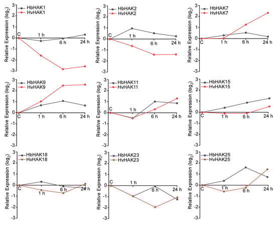 2.2. HbHAK1 Was Upregulated by Salt Stress in Roots with the Differential Expression Patterns