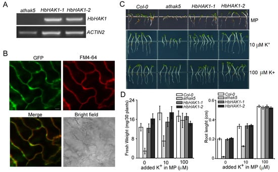 2.3. HbHAK1 Worked as a High-Affinity K+ Transporter on the Plasma Membrane and Involved in Salt Tolerance