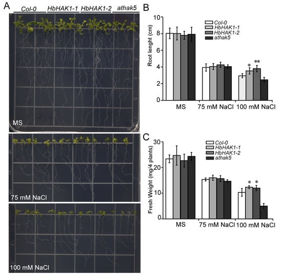 4.3. HbHAK1 Expression Transgenic Lines in Arabidopsis athak5