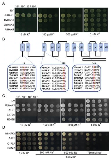 2.5. The Amino Acid Residues C170 and R342 of HbHAK1 Determined the Stronger Transport Activity in Low-K+ Conditions While A13 Under Salt Stress
