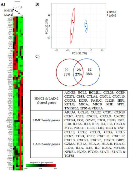 Transcriptional differences between HMC1 and LAD-2 mast cell lines. (A) Heat map and dendrogram, and (B) principal component analysis comparing the basal expression of 84 genes associated with cancer and immunity. (C) Venn diagram showing the number and percentage of genes differentially expressed or shared between both cell lines, and the identity of the genes. Genes in bold are highly expressed genes in both cell lines. Data represent three independent experiments.