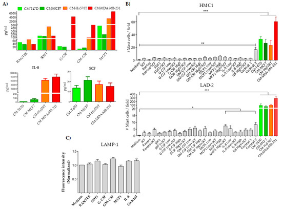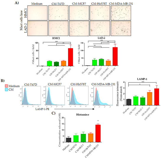 Before stimulation, MCs were allowed to rest in a density of 5 × 105/mL in low-nutrient basal medium for 8 h. After this, the culture medium was discarded and replaced by the conditioned media originating from T47D, MCF7, Hs578T and MDA-MB-231 BrCC, or with fresh low-nutrient basal medium supplemented with RANTES, SDF1, G-CSF, GM-CSF, MCP1, IL-8 and SCF recombinant proteins. Cell cultures were incubated at 37 °C in a humidified 5% CO2 environment. To measure degranulation and tryptase release, LAD-2 cells were incubated for 30 min with conditioned media from BrCC. MCs and supernatants were separated by centrifugation at 1500 rpm/5 min; then the mast cells were analyzed by flow cytometry and their supernatants were used to measure the tryptase and histamine released as described below. For each experiment, low-nutrient basal medium was used as negative control and Substance p (5 µM; Sigma-Aldrich, Saint Louis, MO, USA) as positive control. For gene expression analysis, mast cells were incubated for 4, 12, 24, 36 and 48 h, and processed as described below.