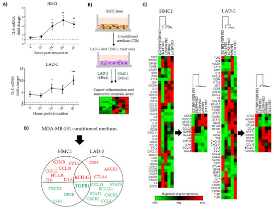 Transcriptional analysis of breast cancer stimulated mast cells. (A) Kinetics of IL-8 expression in HMC1 (top) and LAD-2 (bottom) mast cells in response to the MDA-MB-231 cell-conditioned medium. (B) Flow chart of the experimental design used to evaluate the expression array on stimulated mast cells. (C) Unsupervised heat map and dendrogram of HMC1 (left) and LAD-2 (right) mast cells in response to conditioned media from the breast cancer cell (BrCC) lines. The simplified heat maps and dendrograms show the principal genes responsible for clustering the response to MDA-MB-231 cells. (D) Venn diagram of LAD-2 and HMC1 cells showing uniquely expressed or shared by both mast cell lines after stimulation with MDA-MB-231 cells. Red and green genes represent up-regulation and down-regulation, respectively. In (A), data represent the mean ± SEM from three independent experiments by duplicate, while in (C,D) data represent three independent experiments. * p < 0.05, ** p < 0.01 and *** p < 0.001.