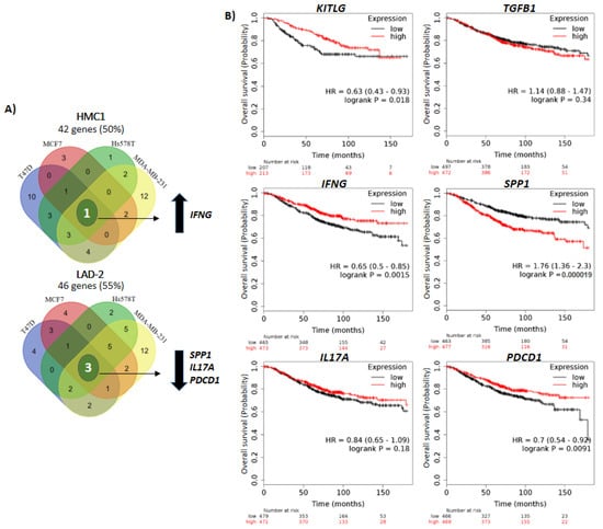Overall survival analysis of breast cancer patients. (A) Venn diagrams of HMC1 (top) and LAD-2 (bottom) showing the intersection of genes changing after stimulation with the breast cancer cell conditioned media. The blue, red, green and yellow zones contain the number of genes changing by conditioned media derived from T47D, MCF7, Hs578T and MDA-MB-231, respectively. Arrows up and down indicate increased and decreased expression, respectively. (B) Overall survival plots comparing high or low expression of relevant genes found in the array analysis using breast cancer public databases. In (A) data represent three independent experiments.