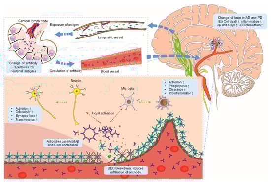 BBB breakdown may result in greater infiltration of the brain by Igs. BBB breakdown was identified in AD post-mortem human studies measuring perivascular accumulation of blood-derived fibrinogen, Ig, thrombin, albumin, and loss of BBB tight junctions. In addition, genetic risk factors for AD, such as APOE, APP, and PSEN1, induce BBB breakdown in animal models [53,54,55,56]. A study revealed that physical BBB breakdown induced by needle insertion can trigger selective IgG localization in the brain parenchyma at the site of injury; in addition, IgG antibodies from neuromyelitis optica spectrum disease patients induce astrocyte pathology in this region [57]. These studies suggest that BBB breakdown in AD results in deposition of Igs in the brain. In addition, failure of the lysosome system in AD could be another possible factor that causes antibody deposition in the brain [58,59].