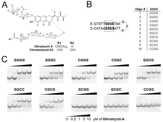 (A) Chemical structures of OA and Chro formed by the tricyclic chromophore (aglycon) glycosylated with di- and trisaccharides. (B) Ten DNA hairpins covering the full set of tetranucleotide binding sites for OA. S stands for G or C; S with a tilde denotes the nucleotide complementary to S. (C) Electrophoretic mobility gel shift assay (EMSA) for the detection of OA binding to ten G/C sites. The concentration of each oligonucleotide in the assay was 50 nM. The gels were stained with SybrGold. Solid wedge represents the increasing concentration of OA.