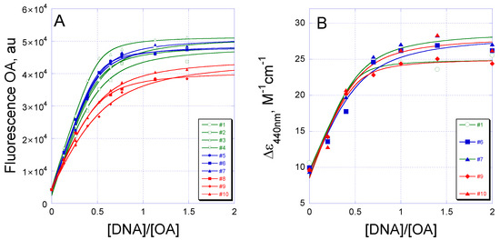 Non-labeled DNA hairpins at low (50 nM) or high (2.5 µM) concentrations (indicated in figure legends) were pre-incubated for 30 min with OA in buffer A containing 100 mM NaCl, 5 mM MgCl2 and 20 mM Tris pH 8.0 before loading on a 10% PAAG. Electrophoresis was run for 1–2 h at 15 V/cm, either in a 45 mM Tris base/45 mM boric acid/1 mM EDTA (0.5× TBE buffer) pH 8.3 or in 0.5× TBM buffer pH 8.3 which contained 1 mM magnesium acetate instead of EDTA. The OA–DNA complexes at the high concentration were directly visualized by intrinsic fluorescence on a ChemiDoc™ XRS+ System (BioRad, Hercules, CA, USA) after UV excitation of the bound drug. Then, the same gels were stained with ethidium bromide (EtBr) for 15 min to detect DNA. The OA–DNA complexes formed at the low DNA concentration were visualized by staining the gel with SybrGold and scanning in the Typhoon FLA 9500 fluorescence scanner (GE Healthcare, Chicago, IL, USA) equipped with a 473-nm blue LD laser and LBP filter.