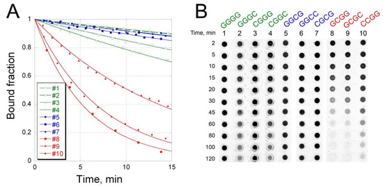 To resolve the inconsistency between the results of EMSA and equilibrium studies in solution, we investigated the kinetics of OA–DNA complex formation. A considerable increase in OA fluorescence upon binding to DNA provides an easy approach for monitoring the association/dissociation kinetics of OA–DNA interaction. The rate of complex formation turned out to be independent of the nucleotide sequence of the binding site (Figure S6): the association constants k+ calculated for each hairpin were in the range 2–5 × 104 M−1 s−1 (Table 2). On the contrary, the dissociation rate significantly differed depending on the G/C context of the binding site (Figure 3A). The fastest dissociation was observed for hairpins 8–10, carrying the binding sites with an SCGS pattern. The lifetime of OA complexes with these oligonucleotides was 10–20 min. In striking contrast, OA dissociation from SGCS or SGGS sites was significantly slower (Figure 3A, Table 2).