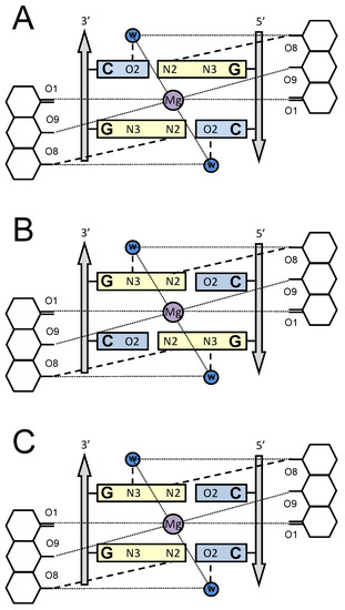 An understanding of the differential behavior of OA upon interaction with three types of DNA binding sites, SGCS, SCGS or SGGS, requires consideration of molecular models of the corresponding drug–DNA complexes. High structural similarity between OA and Chro molecules (Figure 1A), as well as similar results for the two drugs in biochemical tests including footprinting assays [11,28], suggests that the pattern of interaction of OA and Chro with DNA is very much akin. The X-ray structure for the complex of Chro with GGCC binding site [12], containing the central dinucleotide GC, provided the basis for building a model of the drug interaction with the other sites containing central GG and CG dinucleotides (Figure 5). The X-ray model revealed the interaction of the minor groove edges of the two central GC base pairs with the aglycon moieties of the OA dimer and absolute requirement the amino group in guanine and the keto group in cytosine for the specific recognition and accommodation of the antibiotic’s dimer in the DNA minor groove (Figure 5A) [12]. Since the specificity of OA is defined by the two central base pairs, the models are illustrated by the scheme of interaction between the central dinucleotide, GC, CG or GG, of the binding site and the aglycon moiety of the drug. The aglycon moieties of the OA dimer interact with the G-C edges of the minor groove via direct hydrogen bonding and indirect contact via water molecules. Other types of contact between the antibiotic and DNA, such as interactions with phosphate groups, are absent in the scheme in Figure 5 since they are not specific to the nucleotide context of the binding site. The geometry of the G-C base pair within the DNA double helix is such that the substitution of a G-C base pair with a C-G would leave the position of the guanine amino group unchanged (because it is located right in the center of the minor group), while O2 of C would be replaced by N3 of G and vice versa. Since both groups are known to be efficient acceptors of H bonds, one may suppose that G-C to C-G flipping would not change the ability of the minor groove to accommodate the OA dimer (Figure 5B,C). The model of OA interaction with the three types of binding sites, SGCS, SCGS or SGGS, preserves all hydrogen bonds between the OA dimer and DNA. It is also in agreement with CD studies that argue for structural similarities of OA complexes with SGGS, SGCS or SCGS sites (Figure 2). Similar energetic parameters of the drug–DNA interaction with different sites obtained by ITC (Table 1) support this model of a similar hydrogen bond network for three types of binding sites. Contrary to the ITC results for another antibiotic, Mithramycin, that supported entropically driven binding to DNA [29], we found the enthalpy driving nature of OA’s interaction with DNA. Considerable enthalpy change upon binding is typical for most minor-groove DNA ligands due to the dominating role of hydrogen bonds in the formation of the drug–DNA complex. Although the number of hydrogen bonds is proposed to be conserved for different DNA binding sites, differences in enthalpy could be explained by less favorable H-bond angle formation for guanine N2 in the central G-C base pairs [14].