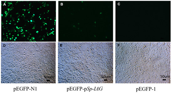 The green fluorescence (EGFP) were detected in human embryonic kidney cell line HEK293FT cells after transfection for 24 h, the results showed that EGFP can be detected in cells transfected with pEGFP-N1 (Figure 1A) and pEGFP-pSp-IAG (Figure 1B), but not in cells transfected with pEGFP-1 (Figure 1C). pEGFP-N1 used as a positive control contains cytomegalovirus (CMV) promoter, which can effectively turn on the expression of EGFP. EGFP in cells transfected with pEGFP-pSp-IAG demonstrated promoter activity at 5′-flanking sequence, while pEGFP-1 serving as negative control did not produce any fluorescence. Cells in bright fields are observed and shown in Figure 1D–F, separately.