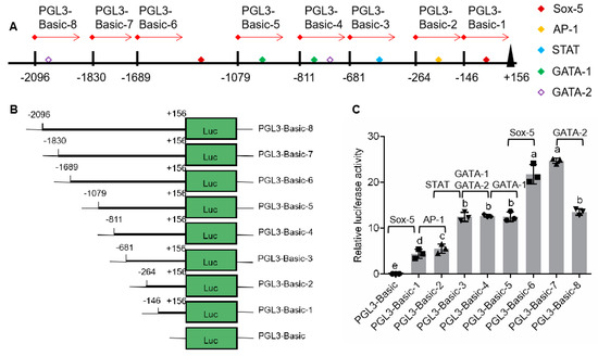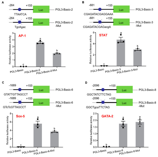 Analysis of binding site of transcription factors with site-directed mutation (SDM). Schematic diagram of reporter vectors and analysis of relative luciferase activity of activator protein 1 (AP-1)-binding site (A), signal transducers and activators of transcription (STAT)-binding site (B), Sox-5-binding site (C) and GATA-2-binding site (D). pGL3-Basic was the negative control. Data are presented as mean ± SEM (n = 3) with different letters indicating significant differences at p < 0.05. The blue dots mark transcription factor binding sites, and blue dots and blue X represent transcription factor binding sites with SDM.