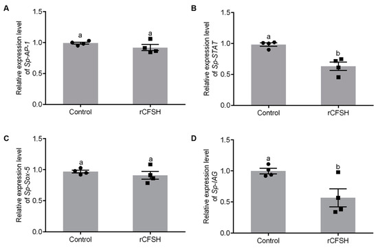 Analysis of transcription factors expression in the androgenic gland (AG). The expression of AP-1 (A), STAT (B), Sox-5 (C), and Sp-IAG (D). Control: The AGs of control group; rCFSH: The AGs treated with 10−6 M rCFSH. The data are presented as mean ± SEM (n = 4) with different letters indicating statistical significance at p < 0.05.