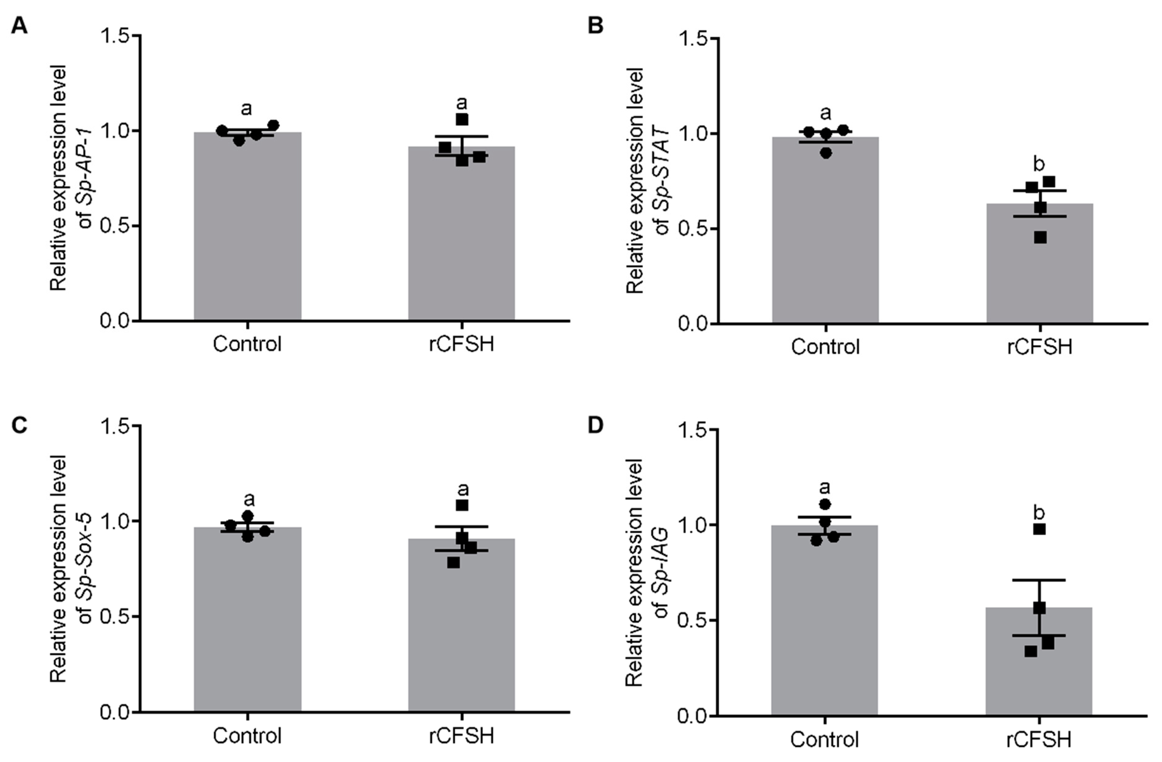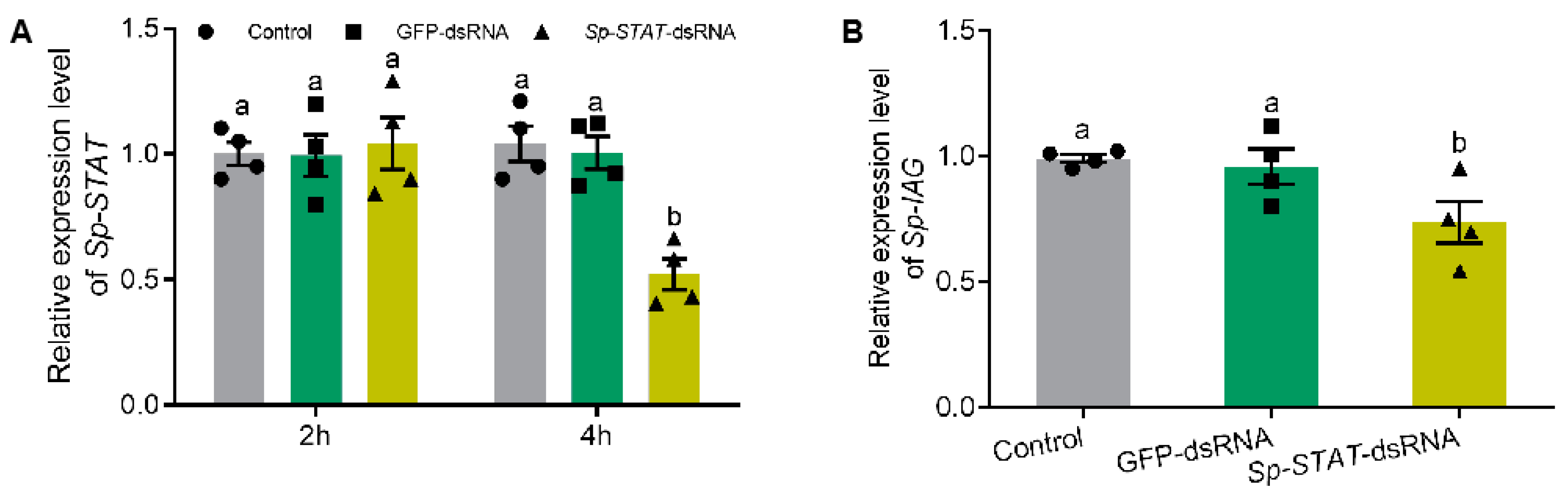 2.5. Knockdown of Sp-STAT Reducing Expression of Sp-IAG
