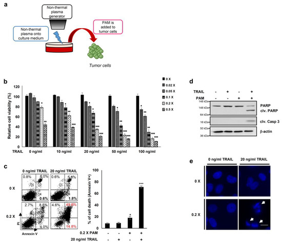 PAM and tumor necrosis factor-related apoptosis-inducing ligand (TRAIL) synergistically induce cancer cell death. (a) Preparation of plasma activated medium (PAM) using a non-thermal plasma generator system. PAM was generated by exposing DMEM or RPMI-1640 medium to non-thermal plasma jet at a distance of approximately 2 cm. (b) HeLa cells were treated with TRAIL at various concentrations (10 to 100 ng/mL) in the absence or presence of serially diluted PAM as indicated. Cell viability was assessed after 24 h of treatment using the MTT assay. * p < 0.05, ** p < 0.01, *** p < 0.001. (c) Cell death was analyzed using fluorescence-activated cell sorting (FACS) following Annexin V and propidium iodide (PI) staining. Left panel shows a representative image of necrosis and early and late apoptosis. Right panel shows statistical analysis of cell death. * p < 0.05, *** p < 0.001). (d) PAM promoted TRAIL-mediated apoptosis. Immunoblotting was performed using antibodies directed against cleaved caspase 3, PARP, and actin. (e) Condensation and fragmentation of the nuclei were detected via 4′,6-diamidino-2-phenylindole (DAPI) staining. Arrows: fragmented nuclei. Scale bar: 10 μm.