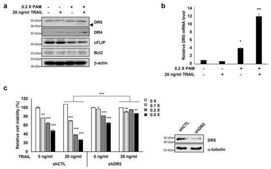 Co-treatment of PAM with TRAIL induces apoptosis via DR5 upregulation. (a) Combined treatment of PAM with TRAIL upregulates DR5 protein levels and downregulates c-FLIP protein levels in HeLa cells. Cells were treated with 0.2× PAM, TRAIL (20 ng/mL), or PAM/TRAIL (0.2× PAM with 20 ng/mL TRAIL). Cell extracts were prepared for immunoblotting of DR5, DR4, c-FLIP, Bcl-2, and β-actin. For immunoblotting, β-actin used as loading control. (b) DR5 mRNA levels were determined by qRT-PCR. GAPDH used as an internal control. (c) Silencing of DR5 gene was abrogated synergistic effects of TRAIL to PAM-mediated cell survival inhibition. shCTL or shDR5-transfected HeLa cells were treated 0 or 20 ng/mL TRAIL with serial diluted PAM for 24 h. Cellular growth inhibition was determined via the MTT assay. * p < 0.05, ** p < 0.01, *** p < 0.001.