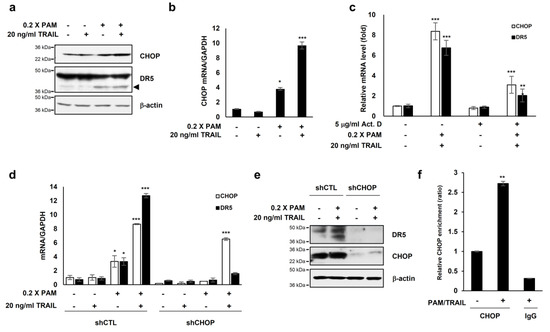 The transcription factor CCAAT/enhancer binding protein (C/EBP) homologous protein (CHOP) is known to activate DR5 transcription [23] resulting in TRAIL sensitization in various cancer cells [16,24]. Our investigations showed that PAM or PAM/TRAIL treatment induced CHOP expression at both protein and mRNA levels (Figure 3a,b), concomitant with the increase in transcriptional and protein expressions of DR5 (Figure 2a,b). We investigated if treatment with PAM/TRAIL upregulates CHOP expression, which in turn increases DR5 expression. Actinomycin D abrogated PAM/TRAIL-induced up-regulation of both CHOP and DR5 transcriptions (Figure 3c). We used CHOP knockdown to investigate the relationship between PAM/TRAIL treatment and DR5 mRNA upregulation. In the absence of CHOP, PAM/TRAIL treatment did not increase expression of DR5 mRNA or protein (Figure 3d,e). To see whether CHOP is implicated in the PAM/TRAIL-induced DR5 transcription, we performed ChIP-qPCR assay. CHOP was recruited at the DR5 promoter (−276 to −264) [25] in the presence of PAM/TRAIL (Figure 3f). These results demonstrate that PAM/TRAIL treatment induces CHOP-mediated upregulation of DR5 expression.