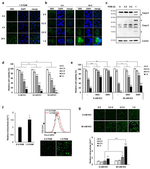 PAM promotes membrane-bound DR5 redistribution. HeLa cervical cancer cells (a) and HT-29 colorectal cancer cells (b) were treated with serially diluted PAM for 4 or 24 h. Original magnification: × 630. Scale bar: 10 μm. After PAM treatment, cells were fixed with 4% paraformaldehyde for 15 min followed by immunostaining with anti-DR5 antibody. DR5 clustering was detected by fluorescence microscopy. (c) HeLa cells were treated with PAM for 24 h, as indicated. Caspase 8 protein levels were determined by immunoblotting. β-actin was used as a loading control. Arrow head: cleaved form of caspase 8. (d) The effects of PAM on A549 cancer cells. A549 lung cancer cells were treated with serially diluted PAM supplemented with 0, 25, or 50 mM KCl for 24 h. Cell viability was measured using the MTT assay. (e) The antioxidants, N-acetyl-cysteine (NAC), and reduced glutathione (GSH) abrogate the impaired ion homeostasis induced by PAM. A549 cells were treated with serially diluted PAM in the absence or presence of 50 mM KCl supplemented with 2 mM NAC or 1 mM GSH for 24 h. (f) Intracellular concentration of Ca2+ was measured following PAM treatment of A549 cells. After incubation with 2 μM Fluo-4, AM for 45 min, intracellular Ca2+concentration was analyzed by FACS analysis or by fluorescence microscopy. Scale bar: 50 μm. (g) U2OS cells were treated with serially diluted PAM in the absence or presence of 50 mM KCl for 24 h, and then the level of intracellular Ca2+ was evaluated. * p < 0.05, ** p < 0.01, *** p < 0.001. Scale bar: 50 μm.