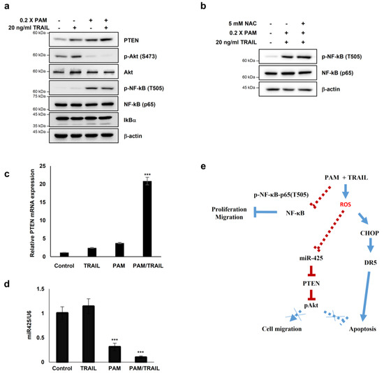 PAM sensitizes cancer cells to TRAIL-induced apoptosis via modulation of the miR-425-PTEN-Akt axis. (a–d) HeLa cells were treated with TRAIL with or without PAM for 24 h. (a) PTEN, phospho-Akt1 (S473), Akt1, NF-κB, phospho-NF-κB (T505) and IκBα protein levels were determined by immunoblotting. β-actin was used as a loading control. (b) HeLa cells were pretreated with 5 mM NAC for 1 h before TRAIL treatment in the presence of PAM. After 24 h, phosphor-NF-κB (T505) and NF-κB protein levels were observed by immunoblot analysis. (c) PTEN mRNA levels were determined by qRT-PCR. *** p < 0.001. (d) miR-425 levels were determined via qRT-PCR. *** p < 0.001. (e) Proposed model for PAM-mediated TRAIL sensitization. Our work has revealed that combinational treatment with PAM and TRAIL stimulates ROS-dependent apoptosis by two attributes; (1) via CHOP-mediated upregulation of DR5 transcription (solid blue line), and (2) via miR-425 suppression-mediated PTEN upregulation, resulting in Akt inactivation (solid red line). In this study, PAM and TRAIL cotreatment induces inhibitory phosphorylation of NF-κB (solid red line). Previous studies have provided evidences that active NF-κB and phospho-Akt promote proliferation and migration (dotted blue lines).