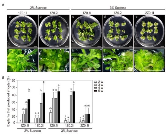 Effect of hormones and sucrose concentration in the shoot induction medium (SIM) for adventitious shoot formation. (A) Cotyledon explants of 4-days-after-germination seedlings were cultured in SIM. Plant explants 4 weeks (a–e) and 5 weeks (f–j) after incubation. (a,f) 1 mg L−1 Zeatin, 0.1 mg L−1 Indole-3-acetic acid (IAA), and 2% sucrose; (b,g) 1 mg L−1 Zeatin, 0.2 mg L−1 IAA, and 2% sucrose; (c,h) 1 mg L−1 Zeatin, 0.1 mg L−1 IAA, and 3% sucrose; (d,i) 1 mg L−1 Zeatin, 0.2 mg L−1 IAA, and 3% sucrose; (e,j) 2 mg L−1 Zeatin, 0.1 mg L−1 IAA, and 3% sucrose. Scale bars = 1 cm. (B) The efficiency of adventitious shoot formation for different combinations of treatments of Zeatin, IAA, and sucrose. Three independent experiments were performed on 81 explants. Error bars represent SD (N = 81). Different letters on the bars indicate significant differences between each treatment (ANOVA followed by a Tukey’s test, p < 0.05). Z = Zeatin; I = IAA; w = weeks.