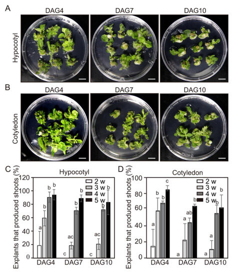 To investigate the effect of explant ages on adventitious shoot formation, hypocotyl and cotyledon explants from 4-, 7-, and 10-day-old seedlings (Figure S1A) were incubated in the above-mentioned culture conditions. After 2 weeks of incubation, the frequency of adventitious shoot formation from each explant was examined at one week intervals. The total number of newly formed shoots was counted every week from the second to the fifth week of the culture. The number of morphologically normal shoots was counted, excluding abnormal shapes such as examples with single leaves. After 5 weeks of incubation, over 80% of hypocotyl explants were able to form adventitious shoots regardless of explant ages (Figure 2A,C). As with the hypocotyl explants, over 75% of cotyledon explants could also produce adventitious shoots regardless of explant ages (Figure 2B,D). Therefore, the explant age did not play a crucial role in adventitious shoot formation from hypocotyl and cotyledon explants when the culture period was fully extended. However, if the incubation period was shortened, the frequency of adventitious shoot formation from hypocotyl and cotyledon explants was significantly affected by explant age. Even after 2 weeks of incubation, 20% of hypocotyl explants derived from 4-day-old seedlings were able to form adventitious shoots. However, no adventitious shoot formation was observed from the hypocotyl explants derived from 7- and 10-day-old seedlings under the same incubation period. After 3 weeks of incubation, the frequencies of adventitious shoot formation from hypocotyl explants derived from 4-, 7,- and 10-day-old seedlings were 59%, 18%, and 20%, respectively (Figure 2C). These results clearly show that the younger hypocotyl explants could undergo shoot formation the fastest.