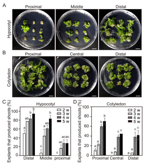 After 5 weeks of incubation, abundant shoots formed on the distal segments of the hypocotyl; however, the number of shoots was significantly lower in cultures of the middle and the proximal segments (Figure 3A,C). Interestingly, the frequency of adventitious shoot formation increased along the hypocotyl axis of 4-day-old seedlings. As with the hypocotyl explants, the frequency of adventitious shoot formation from the three segments of cotyledon explants also varied significantly depending on position (Figure 3B,D). The frequency of adventitious shoot formation from the proximal segment was much higher than those from the central and the distal segments of the cotyledon explants. The segment closest to the hypocotyl axis produced the most adventitious shoots. These results suggest that different positions within a single explant vary in their potential for adventitious shoot formation.