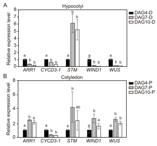 The quantitative reverse transcription PCR (qRT-PCR) analysis showed that the transcripts levels of ARR1, CYCD3-1, WIND1, and WUS genes, but not STM, from hypocotyl explants of DAG4 were much higher than those of hypocotyl explants from DAG7 and DAG10 seedlings. The transcript levels of STM greatly increased in DAG7 and DAG10 hypocotyl explants (Figure 4A). On the contrary, cotyledon explants showed a slightly different expression pattern of these shoot-regeneration regulatory genes depending on explant age. The transcript levels of all the measured shoot-regeneration regulatory genes from the cotyledon explants of DAG4 were slightly lower than those of DAG7 and DAG10 seedlings (Figure 4B). However, the transcript levels of CYCD3-1 were slightly higher in DAG4 cotyledon explants than DAG7 and DAG10 cotyledon explants. These gene-expression profiles from the DAG4 cotyledon explants seemed contradictory to the shoot formation results (Figure 2).