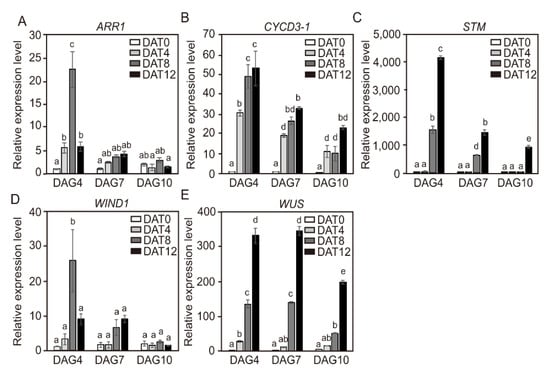 In order to investigate why DAG4 cotyledon explants demonstrated higher adventitious shoot formation than DAG7 and DAG10 explants despite the low initial transcript levels of shoot regeneration regulatory genes, the levels during incubation in shoot induction medium (SIM) were examined. The transcript levels of ARR1, CYCD3-1, STM, WIND1, and WUS genes from cotyledon explants of DAG4, DAG7, and DAG10 seedlings were examined at 4-day intervals after the cotyledon explants were transferred to SIM for shoot formation (Figure 5). The transcript levels of three genes (CYCD3-1, STM, and WUS) sharply increased as the incubation time in SIM was extended. Even more unexpectedly, the quantitative increase in transcript levels was much higher in the DAG4 cotyledons than DAG7 and DAG10. Although the initial transcript levels of the STM and the WUS genes were lower in DAG4 cotyledons than in DAG7 or DAG10, they increased during incubation in SIM (Figure 5B,C,E). However, the transcript levels of ARR1 and WIND1 genes from cotyledon explants of DAG4 were highly increased to higher levels at 8 days after treatment, and this was followed by a decrease at DAT12. During incubation in SIM, the transcript level slightly increased in DAG7, but it was not significant compared to DAG4, and the transcript level in DAG10 did not change during culture period (Figure 5A,D).