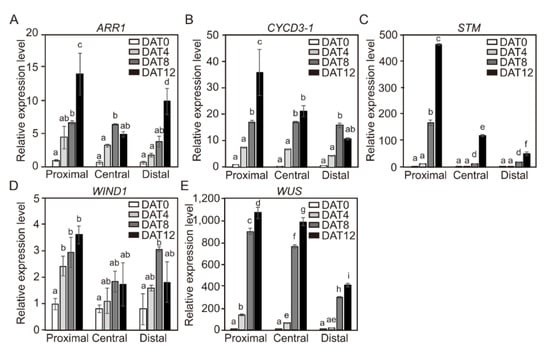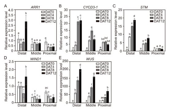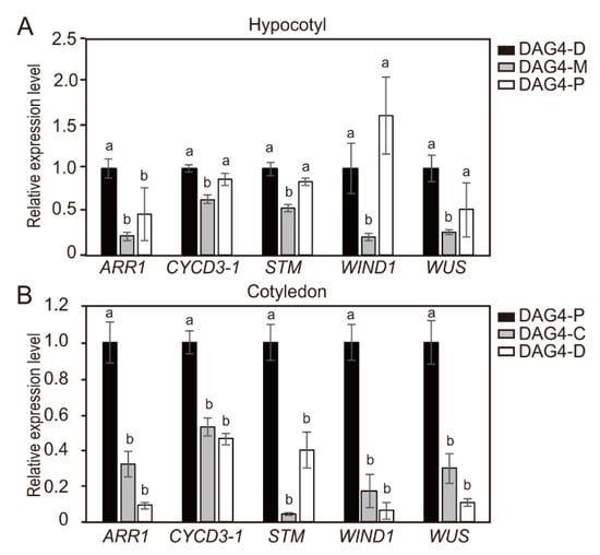 The relative expression levels of CYCD3-1 and shoot regeneration regulatory genes in hypocotyl and cotyledon explants excised from in vitro-grown seedlings in different positions. (A) The relative gene expression levels of ARR1, CYCD3-1, STM, WIND1, and WUS in distal (D), middle (M), and proximal (P) positions of DAG4 seedling hypocotyl explants. (B) The relative gene expression levels of ARR1, CYCD3-1, STM, WIND1, and WUS in proximal (P), middle (M), and distal (D) positions of DAG4 seedling cotyledon explants. Three independent experiments were performed. Error bars represent SD (n = 3). Different letters in each gene indicate statistically significant differences the three DAG groups (AVOVA followed by a Turkey’s test, p < 0.05). DAG = day after germination.