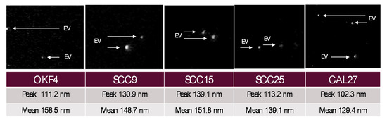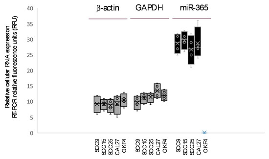Exosomes are small extracellular vesicles ranging from 30 to 100 nm found in eukaryotic fluids that facilitate many cellular functions, including modulation of tumor phenotypes within and between tumor cells [9,10]. Many microRNAs are produced and then exported extracellularly in exosomes [11,12]. Recent evidence now suggests that miR-365 may also function to modulate carcinogenesis and phenotypic behaviors in oral cancers through interactions with nuclear enriched abundant transcript 1 (NEAT1) [13,14,15]. In fact, preliminary studies from this group screened for the cytoplasmic expression of miR-365 among several oral cancer cell lines, some of which were previously tested (Cal27, Scc-9, and Scc-25) and others that had never been evaluated (Scc-4 and Scc-15), and found differential results [16] However, no studies to date have evaluated miR-365 expression among extracellular vesicles and exosomes derived from these specific cell lines. In addition, another related study from this group isolated exosomes and extracellular vesicles from oral cancer stem cells to screen for the expression of several microRNAs (miR-21, -31, -32, -34, -133, -155, and -365)—although only the expression of miR-21, -34, and -155 were observed among the exosomes specific to oral cancer stem cells [17].