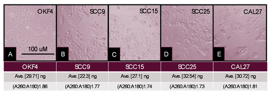 Cell culture and exosome isolation. (A) OKF4; (B) SCC9; (C) SCC15; (D) SCC25; and (E) CAL27 cell lines were established and subsequently cultured in exosome-depleted media for harvesting. Exosomes and extracellular vesicles were isolated from harvested supernatant revealing consistent RNA concentrations (range: 29.71–32.54 ng) and RNA purity (A260:A280 range: 1.73–1.86).