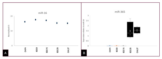 Expression of miR-16 was subsequently used to confirm the presence of microRNA from the extracted exosomes and extracellular vesicles using qRT-PCR (Figure 4). Expression of miR-16 was normalized to RNA input (Figure 4A). The presence of miR-365 was then confirmed and normalized to miR-16 expression, which demonstrated an increased level of miR-365 in both CAL27 and SCC25 cells (Figure 4B). In addition, the normalized relative quantity (RQ) for miR-365 exhibited greater variation among SCC25 (1.382–4.363) than CAL27 cells (1.248–1.536).