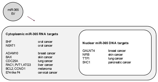 Cytoplasmic and nuclear targets of extracellular vesicle-derived miR-365. Some molecules known to be modulated by miR-365 expression in oral cancers may not include the full range of mRNA or DNA targets, as evidenced by miR-365 studies in other cancers such as breast, skin, lung, liver, cervical, and pancreatic cancers.