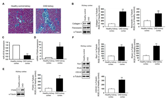 Expression of miR-4516 is downregulated in renal cortical fibrosis in a CKD mouse model. (A) In healthy mice (n = 3) or CKD mice (n = 3), hematoxylin and eosin (H&E) staining was performed on kidney sections (scale bar = 1000 μm). (B) Western blot analysis for collagen type 1, and fibronectin in the kidney cortex of healthy mice and CKD mice (n = 3). Protein expression was determined by densitometry relative to α-tubulin. The values represent mean ± SEM. ** p < 0.01 vs. healthy kidney cortex. (C,D) Expression of miR-4516 and ITGA9 was detected in the kidney cortex of healthy mice (n = 3) or CKD mice (n = 3) by quantitative real-time polymerase chain reaction (qPCR). The values represent mean ± SEM. * p < 0.05, ** p < 0.01 vs. healthy kidney cortex. (E,F) Western blot analysis for ITGA9, Rac1, RhoA, and CDC42 in the kidney cortex of healthy mice and CKD mice (n = 3). Protein expression was determined by densitometry relative to α-tubulin. The values represent the mean ± SEM. ** p < 0.01 vs. healthy kidney cortex.