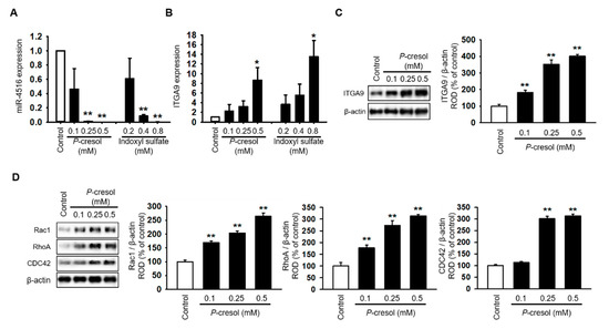 Cytoskeleton reorganization and ITGA9-Rho GTPase signaling pathways are activated due to decreased miR-4516 expression following P-cresol exposure. (A,B) Expression of miR-4516 and ITGA9 was detected in human proximal tubular epithelial (TH1) cells with P-cresol (0.1, 0.25, and 0.5 mM) or indoxyl sulfate (0.2, 0.4, and 0.8 mM) exposure for 72 h (n = 3). The values represent mean ± SEM. * p < 0.05, ** p < 0.01 vs. control. (C,D) Western blot analysis for ITGA9, Rac1, RhoA, and CDC42 in TH1 cells after exposure to various doses of P-cresol (0, 0.1, 0.25, and 0.5 mM) for 72 h (n = 3). Protein expression was determined by densitometry relative to β-actin. The values represent mean ± SEM. ** p < 0.01 vs. control.