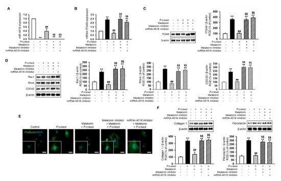 2.2. Melatonin Reduces P-Cresol-Induced Activation of Cytoskeleton Reorganization and Fibrosis via Increased miR-4516 Expression