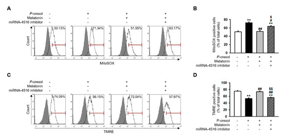 Melatonin inhibits mitochondrial ROS generation and restores mitochondrial membrane potential via increased expression of miR-4516. (A) Flow cytometry analysis of MitoSOX in melatonin-treated TH1 cells (1 μM for 24 h) or cells pre-treated with the miR-4516 inhibitor (200 nM for 48 h) under P-cresol exposure (0.5 mM for 72 h) (n = 3). (B) Quantification of the number of MitoSOX-positive cells. (C) Flow cytometry analysis of TMRE in melatonin-treated TH1 cells (1 μM for 24 h) or cells pre-treated with the miR-4516 inhibitor (200 nM for 48 h) under P-cresol exposure (0.5 mM for 72 h) (n = 3). (D) Quantification of the number of TMRE-positive cells. The values represent mean ± SEM. ** p < 0.01 vs. control, # p < 0.05, ## p < 0.01 vs. P-cresol exposure condition, $ p < 0.05, $$ p < 0.01 vs. melatonin-treated TH1 cells following P-cresol exposure.