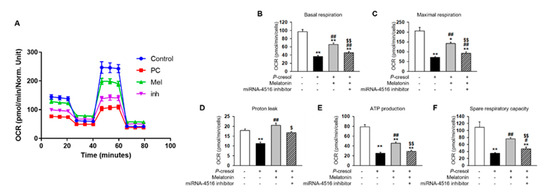 Melatonin restores mitochondrial function via increased expression of miR-4516. (A) Oxygen consumption rate (OCR) of each group was measured over time (min). The mitochondrial OCR was used to obtain bioenergetic parameters by adding oligomycin (20 min, 1 μM), FCCP (40 min, 0.75 μM), and antimycin A (60 min, 1 μM). (B) The non-mitochondrial OCR was subtracted to obtain the basal mitochondrial OCR (remaining OCR after antimycin A addition). (C) FCCP was used to obtain the maximal respiration OCR. (D) Proton leak was calculated using the difference between OCR following oligomycin A inhibition and OCR following antimycin A inhibition. (E) ATP production was determined using the difference between the basal and antimycin A inhibited OCR. (F) Spare respiratory capacity was calculated using the difference between the OCR following oligomycin A inhibition and the OCR following FCCP treatment. The histogram shows representative data from one replicate experiment (n = 5). The values represent mean ± SEM. * p < 0.05, ** p < 0.01 vs. control, # p < 0.05, ## p < 0.01 vs. P-cresol exposure condition, $ p < 0.05, $$ p < 0.01 vs. melatonin-treated TH1 cells in following P-cresol exposure.